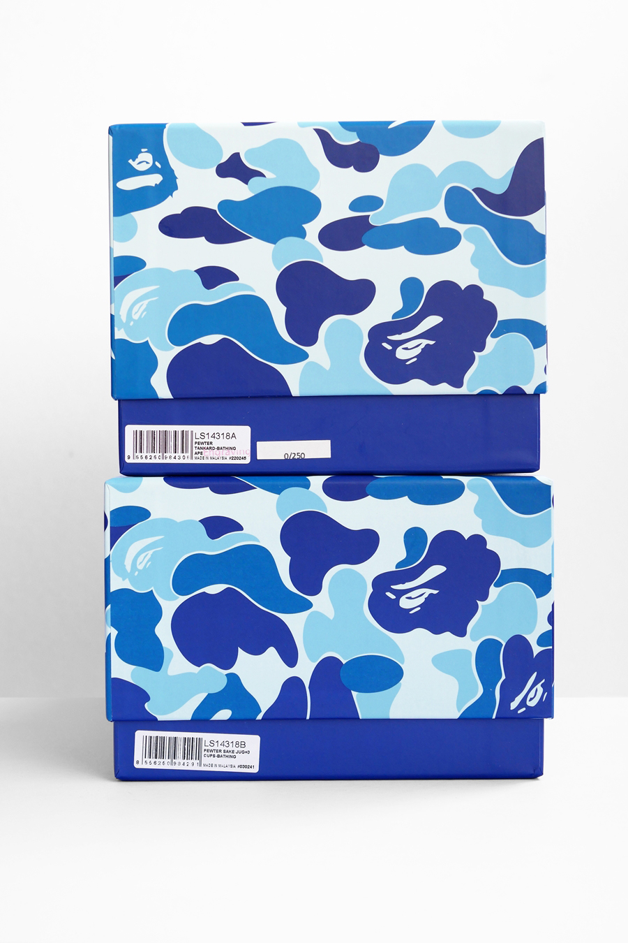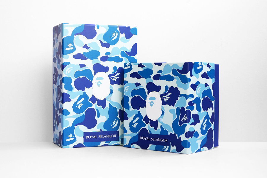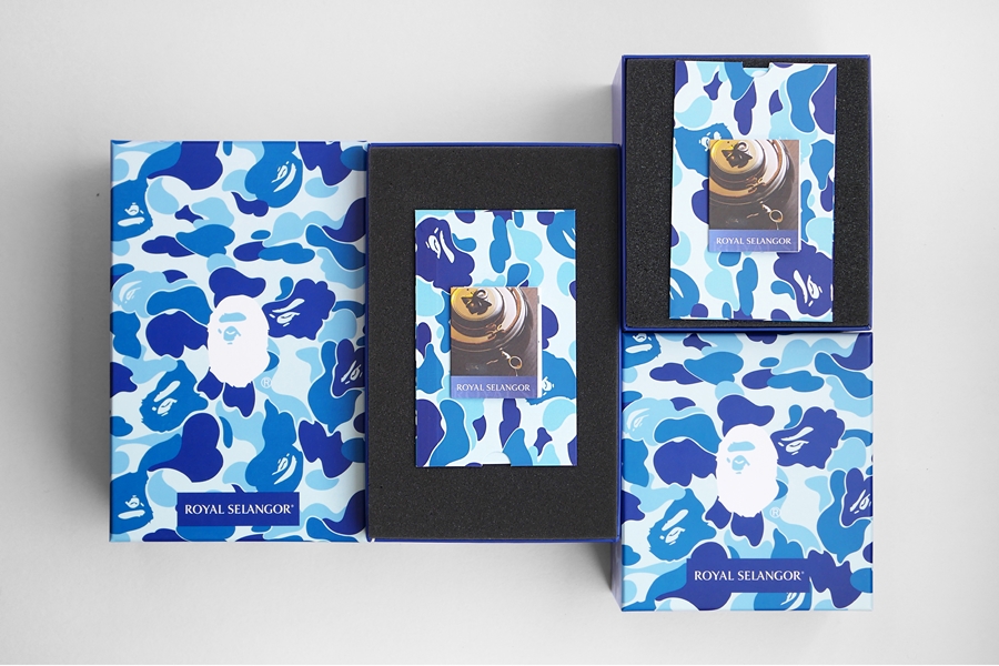 兩款的盒子都是天地蓋設計 ( 盒子和蓋可以分離的就叫天地蓋 ),蓋子上印著滿滿的 BLUE CAMO,中間有個經典 BAPE®︎ 猿人 LOGO,下方則是 ROYAL SELANGOR 的 BOX LOGO: