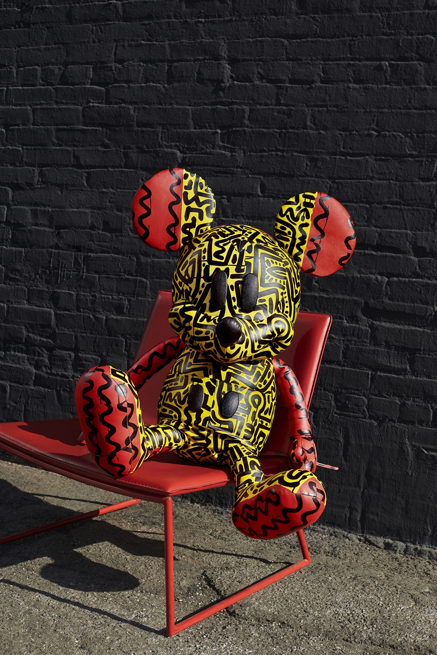 說到這要稍微科普一下 KEITH HARING 這位英年早逝的藝術家,他出生自美國 ( 1958 – 1990 / 享年 31 歲 ),是位活躍於 80 年代的藝術家,他的作品主要是以粗線條反复的圖案呈現,慣以紅色,藍色以及黃色作畫,而他生前最喜愛的卡通人物就是 DISNEY MICKEY MOUSE,因此曾多次以 MICKEY 作為靈感作畫,並曾將 ANDY WARHOLMICKEY 結合成了「ANDY MOUSE」 XD