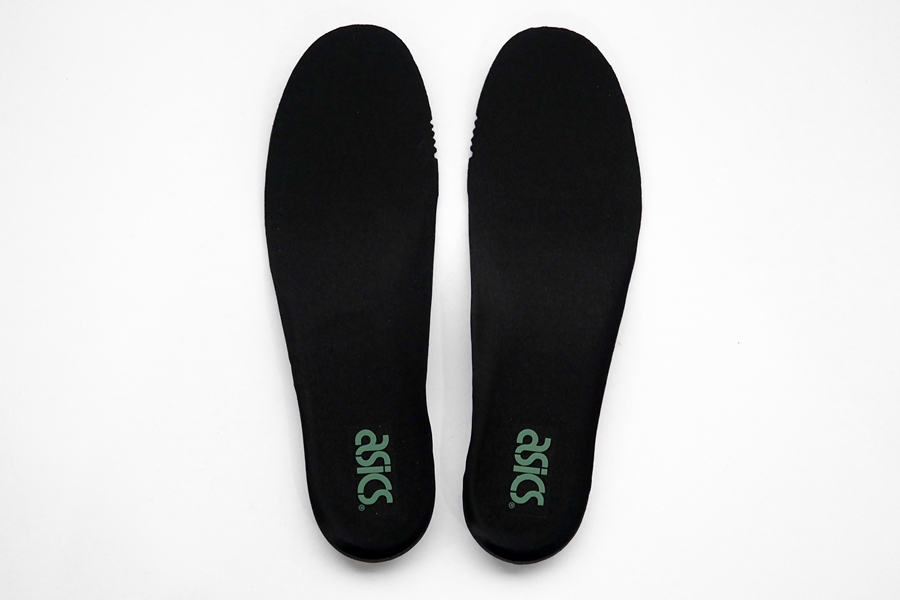 在 ASICS 的流線標誌的部分,遠看像是深灰,但仔細看有兩條有點閃亮亮的綠色效果。