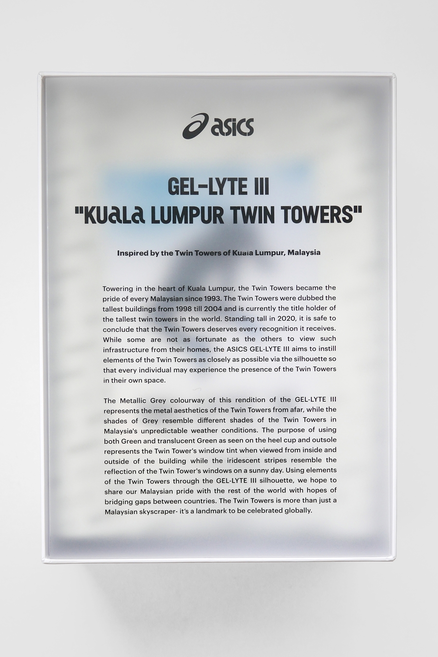 這鞋舌標上的資訊並非 ASICS 或 SNEAKERLAH 的標誌,而是「TWIN TOWERS」的詳細資訊!位置,坐標,完成年份,高度以及樓層一一都列明出來!