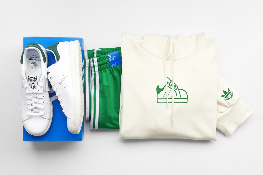 今次的「STAN FOREVER」系列的鞋款採用了「PRIMEGREEN」可持續再生材質製作,而服飾方面同樣也採用了以海洋朔料垃圾再生而成的「PRIMEBLUE」材質編織而成,除了主打的綠色,此系列的米色單品 ( 下圖 ) 都不是刻意染的,那是「PRIMEBLUE」材質原本的模樣,非常的 RAW !