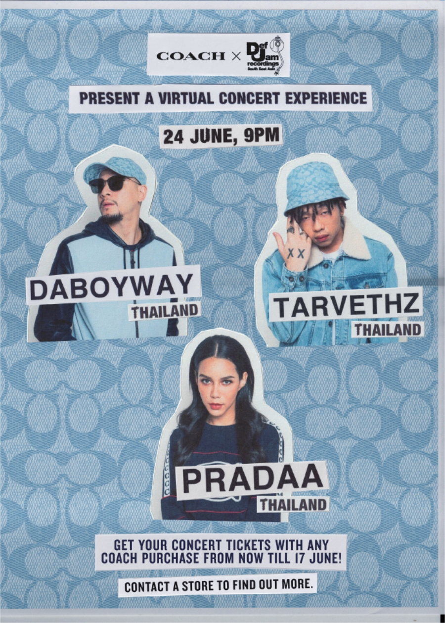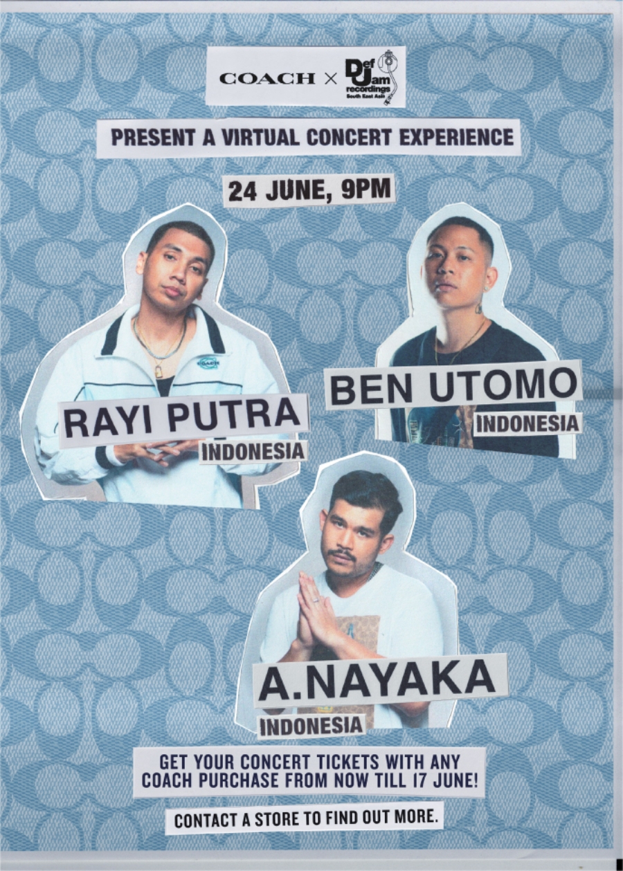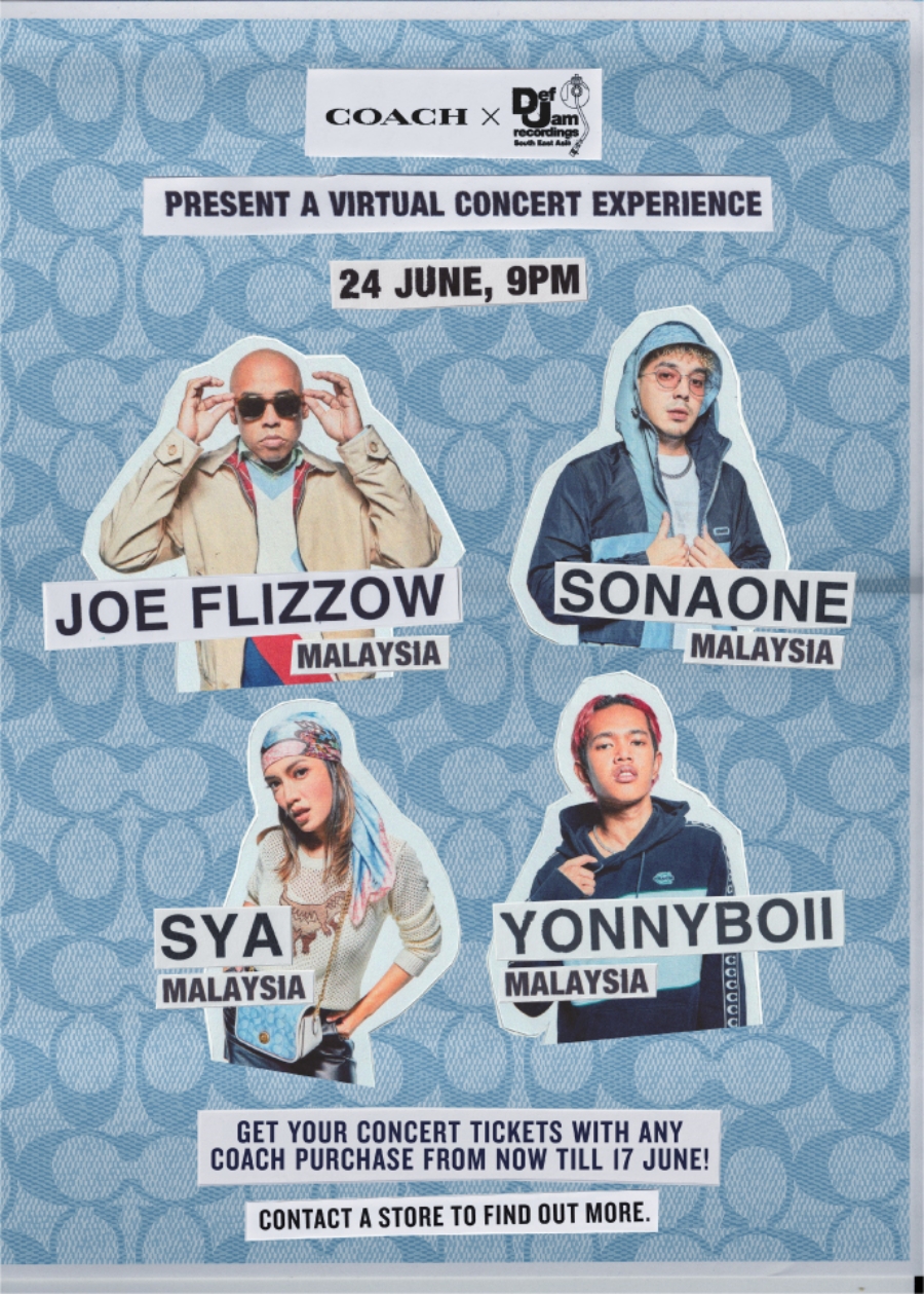 紐約知名輕奢品牌 COACH 與 UMC ( UNIVERSAL MUSIC GROUP ) 旗下的嘻哈音樂廠牌「DEF JAM RECORDINGS SEA ( SOUTH EAST ASIA )」合作在 6 月 24 日 ( 星期四 ) 晚上 9.00 PM 舉辦一場線上演唱會,邀請了 13 位來自馬來西亞,新加坡,泰國以及印尼的著名歌手演出 ~