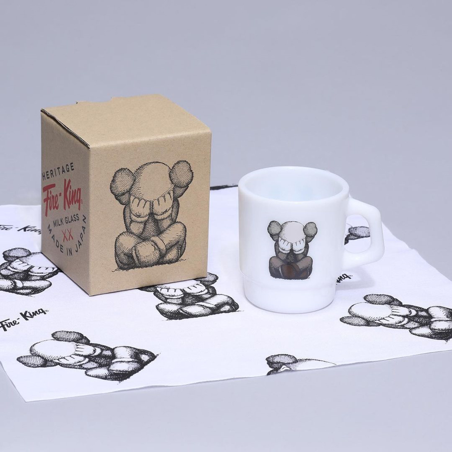 因為除了 UNIQLO 以外,「KAWS TOKYO FIRST」也發布了將在展覽期間發行與知名杯具品牌 FIRE-KING 聯名的兩款杯子,而其中的一款就有這躺姿 COMPANION 的圖案 ~