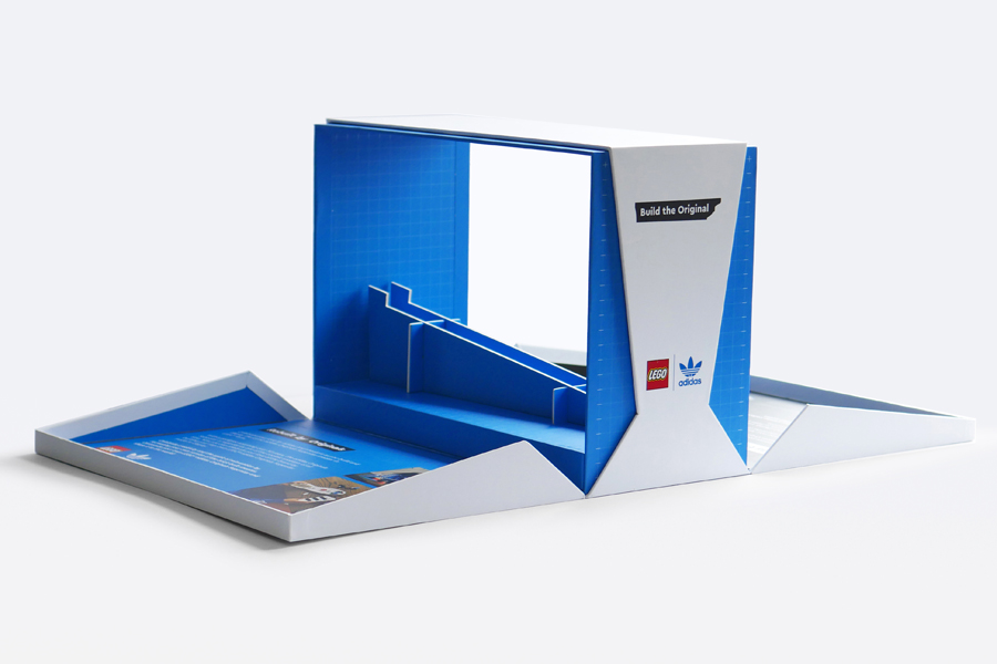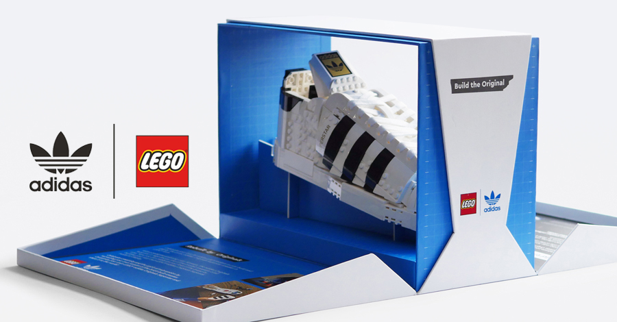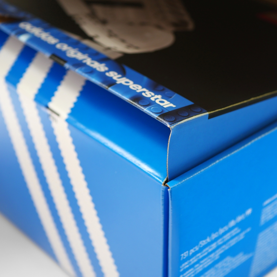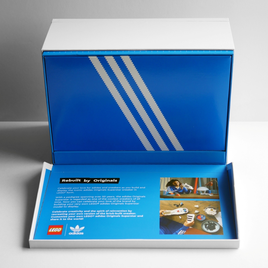 「LEGO® ADIDAS ORIGINALS SUPERSTAR SHOE | 10282」的盒子如同 ADIDAS ORIGINALS 一所沿用的掀蓋式鞋盒 ~