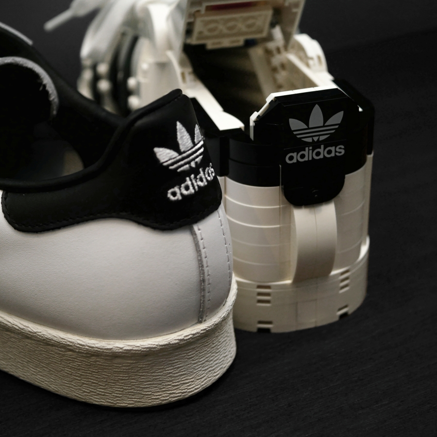 兩者擺在一起 … 「LEGO® ADIDAS ORIGINALS SUPERSTAR SHOE | 10282」整體造型與真鞋也非常的相似,比較明顯的不同就是鞋身多了凸起來的 LEGO® 圓點。