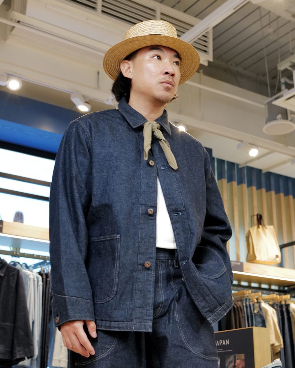喜愛分享穿搭 & 咖啡的單寧愛好者 JD CHANG 著用「 NAVAL SACK COAT 」搭配「 MARKER LOOSE JEANS 」。